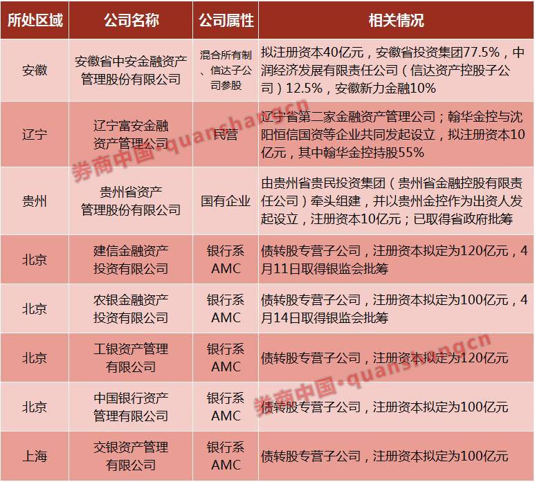 另一方面,银监会还于4月中旬陆续批复筹建建行、农行的债转股实施机构,继银行系首家资产管理公司"兴业AMC"成立后,银行系AMC亦将迎来扩容。