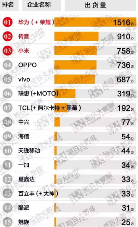 2016年,传音手机出口量已超过8000万部,全部外销,成为国产手机外销冠军; 2017年,传音手机出货量近1.3亿部,继续蝉联非洲手机市场第一,全球总排名第四(前三为三星、苹果、华为),全球功能机排名第一,全球智能手机排名第十(出货量4000万左右);