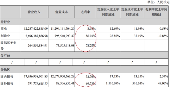 2019年上半年,华东医药分行业中,商业毛利率为8.08%,制造业毛利率为86.03%,国际医美业务毛利率为72.25%;分地区中,国内销售毛利率为32.76%,国外销售毛利率为69.73%。