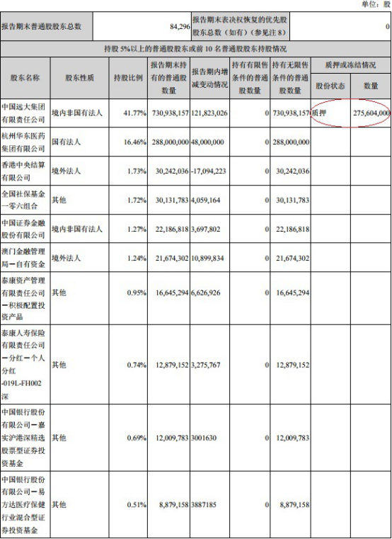 截至2019年上半年末,华东医药前十名股东中共一位股东质押股份。华东医药第一大股东中国远大集团有限责任公司截至2019年上半年末,质押股份数量2.76亿股,期末持有的普通股数量为7.31亿股,持股比例为41.77%。