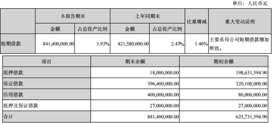 2019年上半年,华东医药短期借款为8.41亿元,上年同期为4.22亿元,同比增长99.58%。其中,抵押借款期末余额为1800.00万元,保证借款期末余额为3.96亿元,信用借款期末余额为4.00亿元,抵押及保证借款期末余额为2700.00万元。