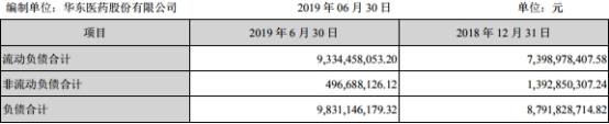 2019年上半年,华东医药负债合计98.31亿元,2018年末为87.92亿元。其中,流动负债合计93.34亿元,非流动负债合计4.97亿元。