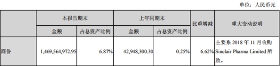 2019年上半年,华东医药商誉为14.70亿元,上年同期为4294.83万元。公司表示,主要系2018年11月收购Sinclair Pharma Limited所致。