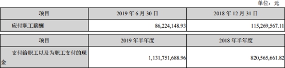 2019年上半年,华东医药应付职工薪酬为8622.41万元,2018年末为1.15亿元;支付给职工以及为职工支付的现金为11.32亿元,上年同期为8.21亿元。