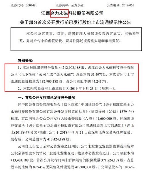 按照解禁比例来看,此番金力永磁解禁数量超过了总股本的一半,实际可上市流通的股份数量占公司总股本的比例也达到44.2410%。