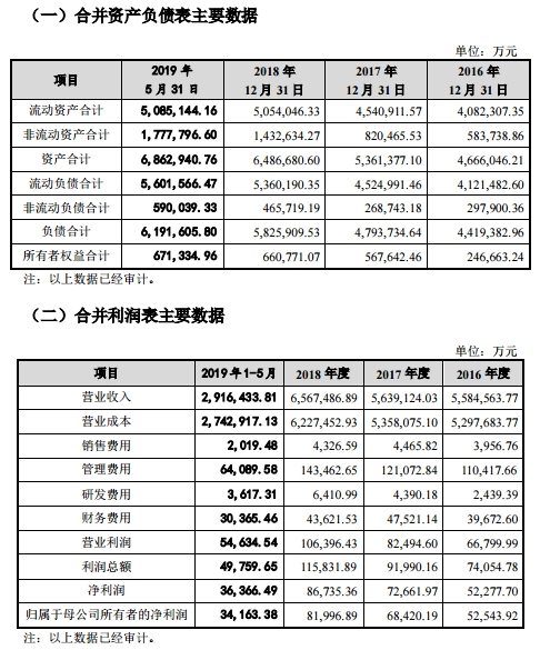 据交易报告书,浙建集团2016年-2019年5月的营业收入分别为558.46亿元、563.91亿元、656.75亿元、291.64亿元,归母净利润分别为5.25亿元、6.84亿元、8.20亿元、3.42亿元。经营活动产生的现金流量净额分别为-1.78亿元、-20.11亿元、-20.56亿元、-52.38亿元。负债分别为441.94亿元、479.37亿元、582.59亿元、619.16亿元。2016年 12月31日、2017年12月31日、2018年12月31日和 2019年5月31日,浙建集团资产负债率(合并口径)分别为 94.71%、89.41%、89.81%和 90.22%。