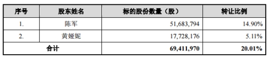 根据多喜爱于2019年4月30日实施的2018年度权益分配方案,标的股份数量相应调整为 6941.20万股,占多喜爱总股本的 20.01%。其中,陈军、黄娅妮拟转让的标的股份数量如下: