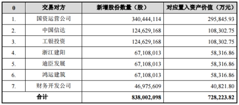 而换股吸收合并方面,多喜爱向浙建集团以非公开发行股份的方式购买置入资产超出置出资产定价的差额部分,并对浙建集团进行吸收合并。根据置出资产交易定价以及置入资产交易定价,多喜爱应向全体交易对方非公开发行股份购买的置入资产的价值为72.82亿元。根据本次发行股份的价格计算,多喜爱通过向交易对方合计发行共计8.38亿股A股股份支付置入资产超出置出资产定价的差额部分。