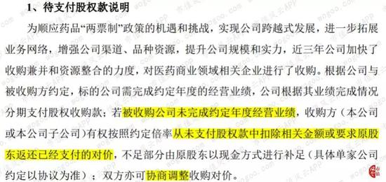 从下表可以看出,一是待支付股权款占比较高,四川海王金仁医药集团现金支付比例为50%,其他四家的现金支付比例均不足三分之一,也就是说,大量股权收购款取决于未来的业绩完成情况。