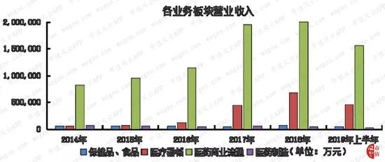 分业务板块来看,医药商业算得上是一骑绝尘,占有绝对领先地位,2019年上半年在总营收中占比为75%,2018年这一数字则是79%。