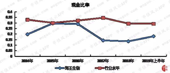 海王生物不仅贷款的规模大,而且期限以短期为主。在偿债能力方面,海王生物的现金比率低于行业水平。截至2019年6月30日,货币资金期末余额为54.96亿元,其中有35.36亿元的资金受限,也就是说,能够用来偿债的资金才19.60亿元。