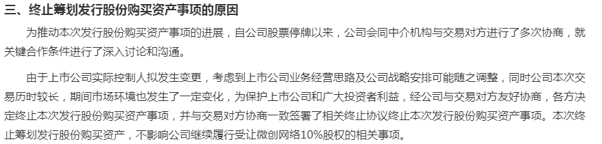 但计划赶不上变化。一年后,由于实际控制人拟发生变更,考虑到公司业务经营思路及战略安排可能随之调整,同时因交易历时较长期间市场环境发生了一定变化,2018年5月鑫茂科技及相关方决定终止发行股份购买资产事项。不过鑫茂科技以8828万元受让了微创网络10%股权。