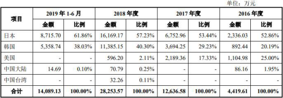 报告期内,神工股份出口日本、韩国和美国的合计业务收入分别为4333.45万元、1.26亿元、2.82亿元和1.41亿元,占主营业务收入的比例分别为98.05%、100.00%、99.64%和99.90%。