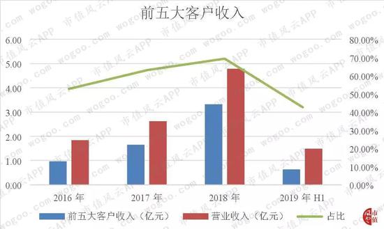 公司2016年至2019年上半年来自前五大客户的收入分别为0.97亿元、1.65亿元、3.32亿元和0.63亿元,占营业收入的比例分别为52.67%、62.96%、69.39%和42.61%,占比均保持在40%以上,公司的客户集中度较高。