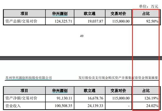 本次交易作价11.5亿元,分别占到华兴源创资产总额12.43亿元、资产净额9.11亿元的91.5%、126.19%。欧立通最近一年营业收入2.4亿元,则占到上市公司10.05亿元的24%。