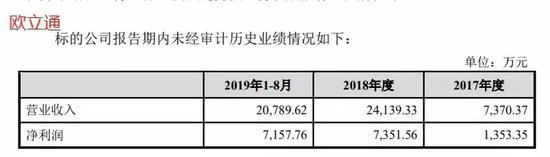 欧立通2017年、2018年、2019年1-8月营业收入分别为7370万元、24139万元、20790万元,净利润分别为1353万元、7352万元、7158万元。