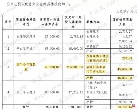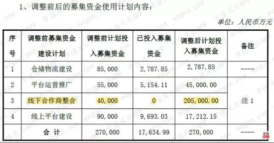 计划中,将对线下合作商整合的投资规模,由4.00亿元,提高至20.50亿元;同时,相应缩减了仓储物流、线上平台建设等计划的投资规模,终止了仓储物流建设项目。