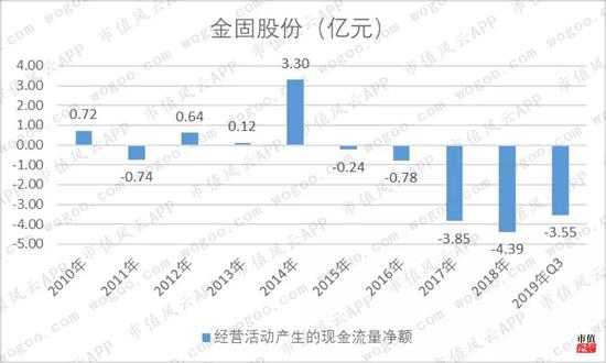 自2015年以来,金固股份的经营活动产生的现金流持续为负;截至2019年9月末,合计已流出了12.80亿元;自2010年上市以来,其经营活动现金流流出额仍高达8.76亿元。