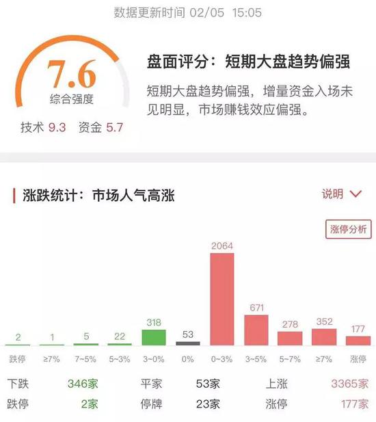 具体来说,沪深两市3700多只股票中,有3365家今天录得上涨,周二上涨公司不到1500家。此外,今天仅2家公司跌停,涨幅超过3%公司家数较昨天多逾400家,涨停公司177家,也较周二有所增多。