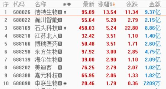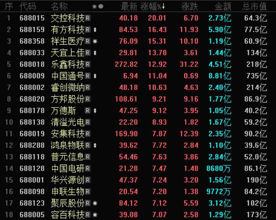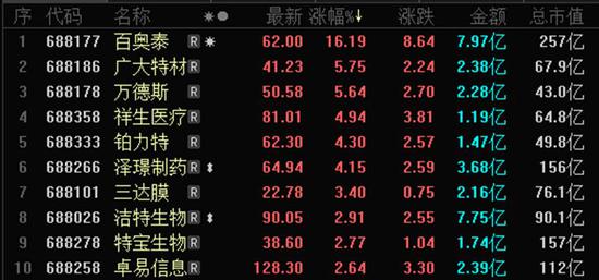 成交额方面,截至收盘,科创板个股合计成交额达215.40亿元,较上个交易日有所收窄。华润微、中微公司成交额均高于10亿元,成交额不到1亿元的科创板个股有29家,其中迈得医疗全天成交额仅有3300万元。