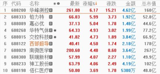 成交额方面,截至收盘,科创板个股合计成交额达275.37亿元,较上个交易日有所放大。华润微、紫晶存储、优刻得、中微公司成交额均高于10亿元,成交额不到1亿元的科创板个股有17家。