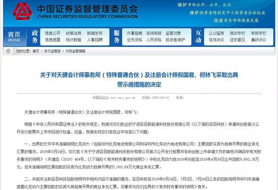 容百科技的审计机构天健会计师事务所及两名经办注册会计师被出具警示函。
