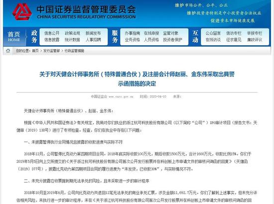 杭可科技的审计机构天健会计师事务所及两名经办注册会计师被出具警示函。