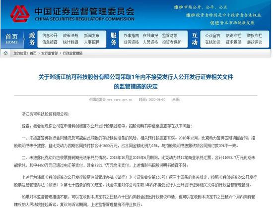 另一家是杭可科技(股票代码688006),公司被采取1年内不接受发行人公开发行证券相关文件的监管措施。