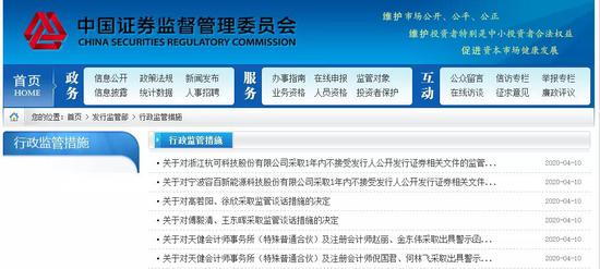 目前,中国证监会官方网站的发行监管部行政监管措施栏目,前6条都被两家科创板企业及其签字保荐代表人和注册会计师包揽。