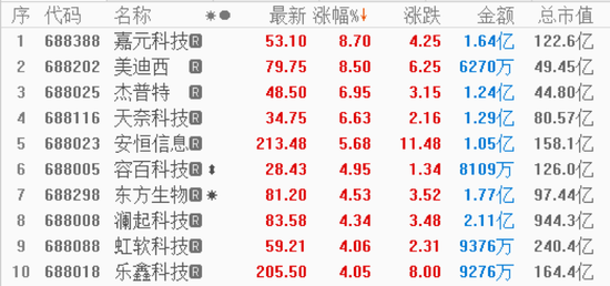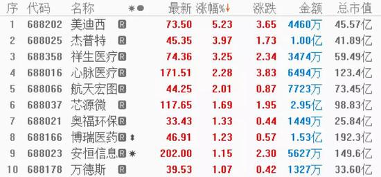 成交额上看,截至收盘,科创板全天成交额121.60亿元,较上个交易日明显放大,并创下3月26日以来的新高。中微公司全天成交额超9亿元;成交额不到1亿元的科创板股票有61家,佰仁医疗(45.930, 0.26, 0.57%)全天成交额1422.56万元。