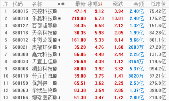 成交额上看,截至收盘,科创板全天成交额90.10亿元,较上个交易日有所放大缩。中微公司全天成交额超7亿元;成交额不到1亿元的科创板股票有69家,奥福环保(35.200, 1.60, 4.76%)全天成交额不到1000万元。