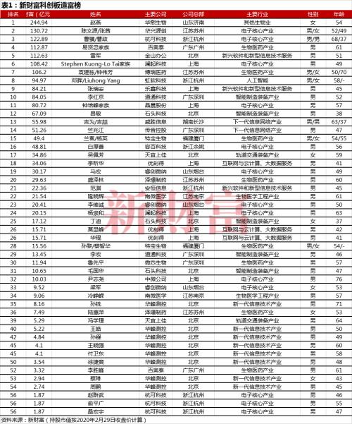 新财富统计截至2020年2月29日上市的91家科创板公司的情况发现,市值100亿元以上的公司有37家。在其中可统计的58名自然人股东中,身家超百亿的有7人,首富被华熙生物的赵燕收入囊中。而石头科技的昌敬,今年38岁,创业5年身家达到67亿元。该公司还有位神秘80后女股东丁迪,合计323万元的投资如今蝶变为17亿元的持股财富。