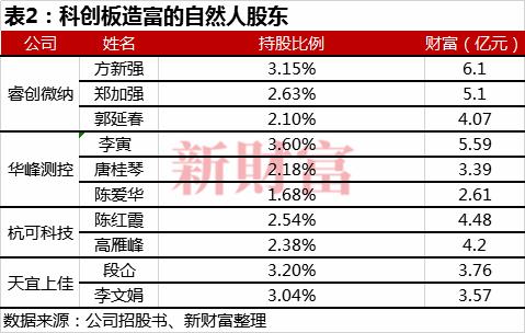 睿创微纳、杭可科技、华峰测控和天宜上佳4家都贡献了身家过亿的自然人股东,上市后他们的持股比例大多集中在2%-4%左右,持股市值均超过2亿元。其中,睿创微纳股东方新强的身家超过6亿元,而杭可科技的陈红霞和高雁峰财富均超4亿元,要高于董事桑宏宇、监事俞平广等高管的身家(表2)。