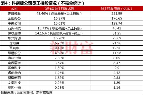 以金山办公、传音控股、石头科技为代表的互联网、软件企业,不仅上市前员工股权激励的范围广,涉及创始股东、核心高管、员工;而且员工持股平台获得的股权占比更高,都高于15%。其中,金山办公和传音控股的员工持股市值都超过百亿元,传音控股高达48%的员工持股比例,为其员工创造了221.99亿元的身家(表4)。