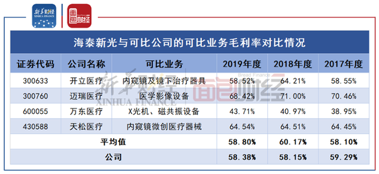 数据显示,2017年至2019年,海泰新光的毛利率分别为59.29%、58.15%和58.38%,可比公司的可比业务毛利率平均值分别为58.1%、60.17%和58.8%。