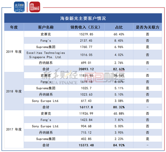 数据显示,2017年至2019年,海泰新光对前五名客户的销售收入占比维持在八成以上。其中,对第一大客户史赛克的销售收入分别为1.19亿元、1.18亿元和1.53亿元,占营业收入的比例分别为65.88%、58.96%和60.43%。