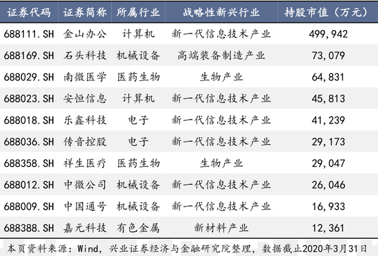 截至2020年一季度,科创板机构投资者持仓市值前十大个股中,超半数属于新一代信息技术产业。金山办公、石头科技、南微医学、安恒信息、乐鑫科技分列机构持股市值前五。