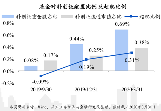 根据兴业证券测算,2019年三季度至2020年一季度,重仓股口径下,机构投资者科创板配置比例由0.08%升至0.69%,超配比例由-0.09%升至0.31%。