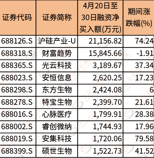 数据显示,4月20日至30日,沪硅产业融资净买入额高达2.12亿元,高居科创板首位。财富趋势紧随其后,融资净买入额为1.58亿元。