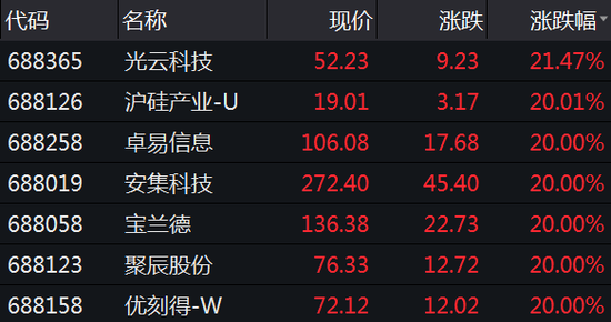 今日,沪硅产业、聚辰股份、卓易信息、优刻得、宝兰德、安集科技等6只科创板股票上涨20%,收获涨停。