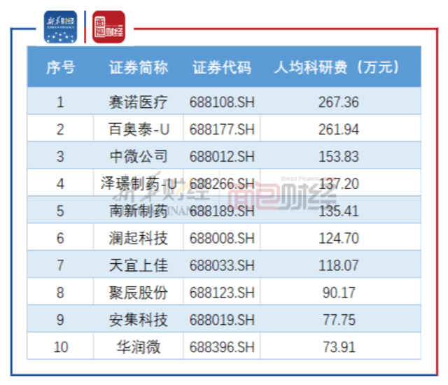 赛诺医疗排在首位,达267.36万元;百奥泰排在第二位,为261.94万元;中微公司位于第三位,为153.83万元,与前两位相差较多。另外,泽璟制药(74.000, 3.23, 4.56%)、南新制药(42.850, -0.10, -0.23%)、澜起科技及天宜上佳人均科研费也超过百万元。