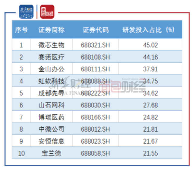 其中,医药行业中的微芯生物及赛诺医疗研发投入占比较高,分别达45.02%及44.16%。金山办公、虹软科技(73.330, 0.50, 0.69%)及成都先导(38.100, -0.17, -0.44%)研发投入占比高于30%,分别为37.91%、34.75%及34.62%。