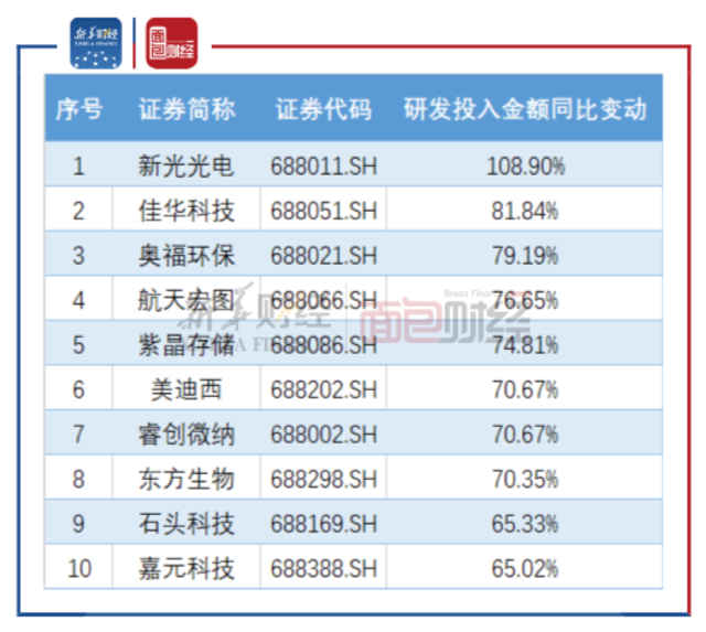 新光光电(39.180, 0.05, 0.13%)、佳华科技(109.110, 1.23, 1.14%)、奥福环保(39.140, -0.32, -0.81%)、航天宏图(49.200, 0.02, 0.04%)、紫晶存储(62.170, 0.37, 0.60%)、美迪西(95.950, -0.22, -0.23%)、睿创微纳(48.000, 0.29, 0.61%)及东方生物(89.410, 0.61, 0.69%)研发投入金额同比增幅超过70%,财富趋势(208.340, 0.35, 0.17%)、澜起科技(103.500, 2.40, 2.37%)、微芯生物(51.390, 0.06, 0.12%)、聚辰股份(76.000, -0.90, -1.17%)、神工股份、华熙生物(101.990, 0.49, 0.48%)及福光股份(36.910, -0.02, -0.05%)研发投入金额同比有所下降。
