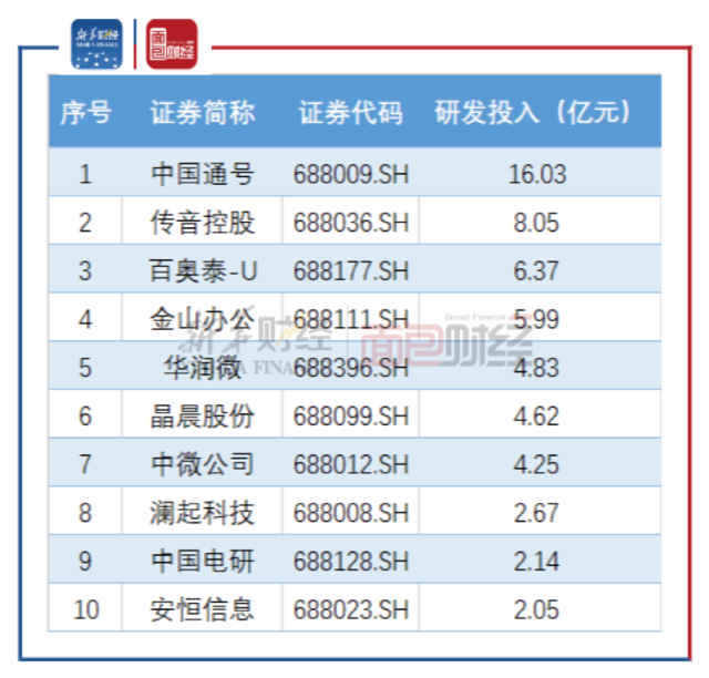 其中,中国通号研发投入金额最高,达16.03亿元。传音控股(55.940, 0.20, 0.36%)、百奥泰(48.300, -0.02, -0.04%)及金山办公(261.700, -0.30, -0.11%)研发投入金额超过5亿元,分别为8.05亿元、6.37亿元及5.99亿元。