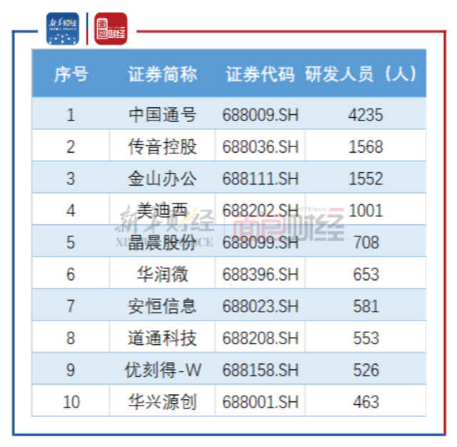 中国通号研发人员数量最多,达4235人;传音控股、金山办公及美迪西分列第二、三、四位,研发人员数量分别为1568人、1552人及1001人。三友医疗(52.250, 1.46, 2.87%)、龙软科技(38.790, -0.32, -0.82%)、联瑞新材、天宜上佳(25.520, 0.10, 0.39%)、佰仁医疗(52.790, 0.35, 0.67%)及神工股份研发人员数量相对较少,均未超过40人。