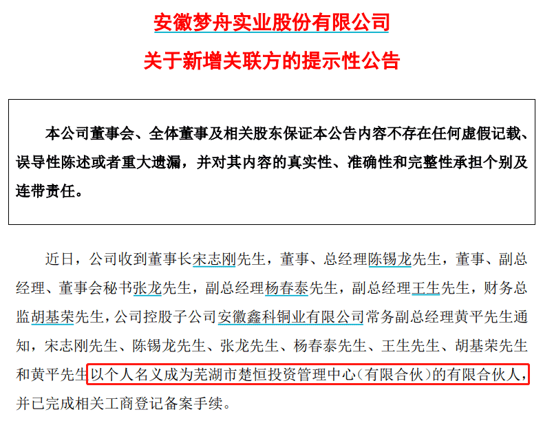 据公告,*ST梦舟董事长宋志刚,董事、总经理陈锡龙,董事、副总经理、董秘张龙,副总经理杨春泰、王生,财务总监胡基荣,控股子公司鑫科铜业常务副总经理黄平,近日以个人名义成为楚恒投资的有限合伙人,并已完成相关工商登记备案手续。