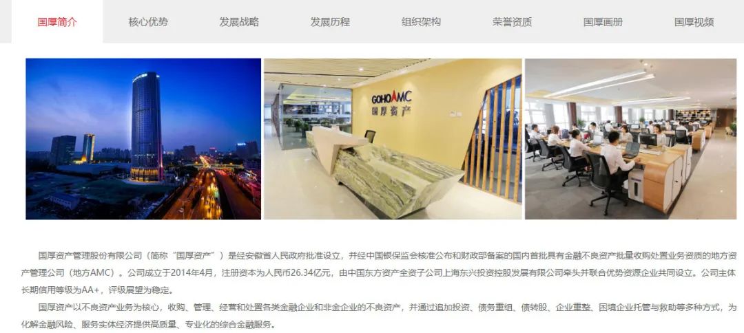 据国厚资产官网介绍,公司是国内首批具有金融不良资产批量收购处置业务资质的地方资产管理公司。公司以不良资产业务为核心,为化解金融风险、服务实体经济提供高质量、专业化的综合金融服务。