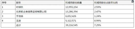 其中,股东叶琼玖、凯士奥、于浩淼、王进在本次减持计划中,拟减持股份占股本比例分别为2.59%、2.47%、1.24%和0.99%。