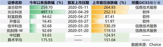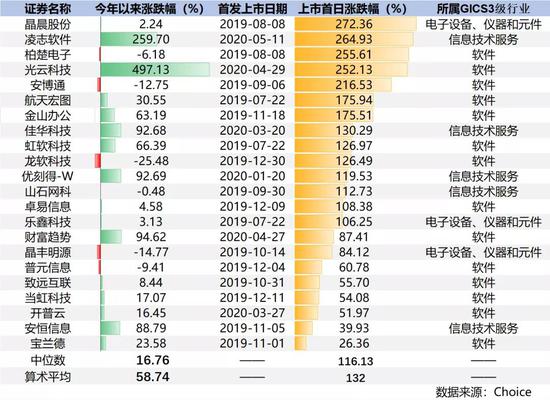 比如,晶晨股份、凌志软件、柏楚电子、光云科技和安博通上市首日涨幅分别高达 272%、264.9%、255.6%、252.13%、和216.52%,它们大多是在去年8月、9月以及在今年的4月、5月上市的。