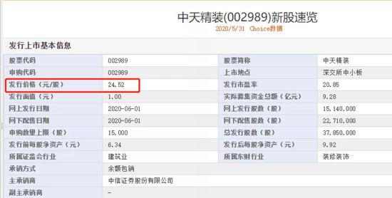 Choice数据显示,今年以来(截至5月29日),中小板新股上市平均8个涨停。若根据今年以来的情况计算,中天精装中一签可盈利可超2.2万元。
